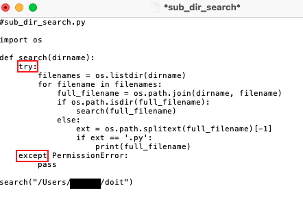 | 6 | 하위 디렉터리도 검색이 가능하도록 다음과 같이 코드 변경 try-except 문 사용 : 에러(오류)가 나더라도 프로그램이 멈추지 않게 해주는 예외 처리 구문(에러는 무시하고 나머지 계속 진행) |