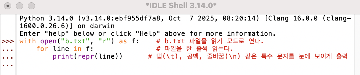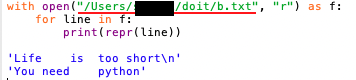 | 9 | 에러출력 | FileNotFoundError: [Errno 2] No such file or directory: 'b.txt' < 에러코드가 출력되면 현재 에디터의 위치를 확인한다. |