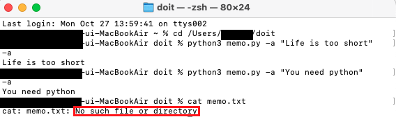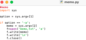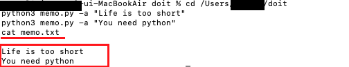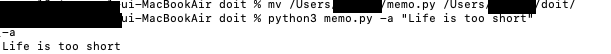 | 2 | 터미널 실행 > cd /Users/유저네임/doit python3 memo.py -a "Life is too short" |