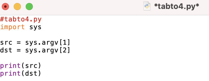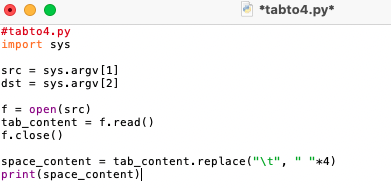 문제: 문서 파일 안에 있는 탭 문자(Tab)=\t를 공백 문자(Space) 4개로 바꾸어 주는 스크립트를 작성해 보자.