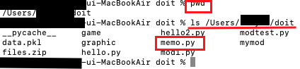 | 5 | but 에러 발생 시 현재 경로 확인 > pwd 입력 실제 memo.py의 위치 확인 > ls /Users/유저네임/doit 입력 (여기서 memo.py 파일이 꼭 보여야 함) 수정시간확인 ls -l /Users/유저네임/doit/memo.py 입력 ※ 두 위치에 서로 다른 memo.py가 두 개 있는 상태라서 Home 쪽을 지우기로 함 rm /Users/유저네임/memo.py |