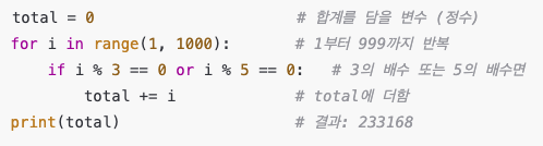 3의 배수와 5의 배수 = 3 또는 5의 배수 = if i%3==0 or i%5==0: total + = i