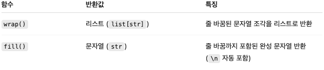 - textwrap.wrap()은 긴 문장을 리스트로 잘라서 줄 바꿈 처리하고, '\n'.join() 또는 fill()을 쓰면 실제 개행된 문장으로 출력할 수 있다.