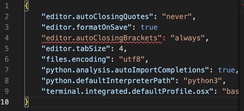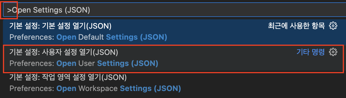 Cmd + Shift + P 입력 → 작은 입력창에 > 기호가 자동으로 찍혀 있어야함(명령어 팔레트) → 그 상태에서 Open Settings (JSON)