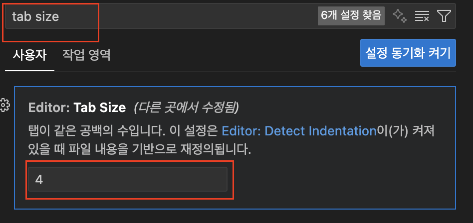 검색창에 tab size 입력 → Editor: Tab Size = 4 (파이썬 표준 들여쓰기)