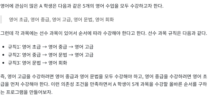 | 기본 개념 | 작업(또는 과목) 간 선후 관계를 정의하고, 가능한 순서를 자동으로 정렬 |