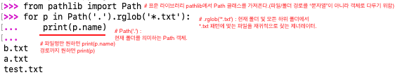 | pathlib.Path.glob() | Path('.').glob('*.txt') | ❌ 현재 폴더만 | generator |