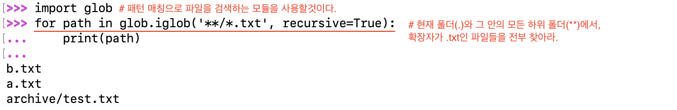 | glob.glob(..., recursive=True) | glob.glob('**/*.txt', recursive=True) | ✅ 하위폴더포함 | list |