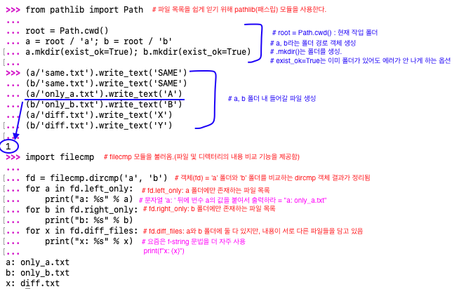 두 디렉터리를 비교하는 객체 생성 | cmp = filecmp.dircmp('dir1', 'dir2') | cmp.report()로 비교 결과 요약 |