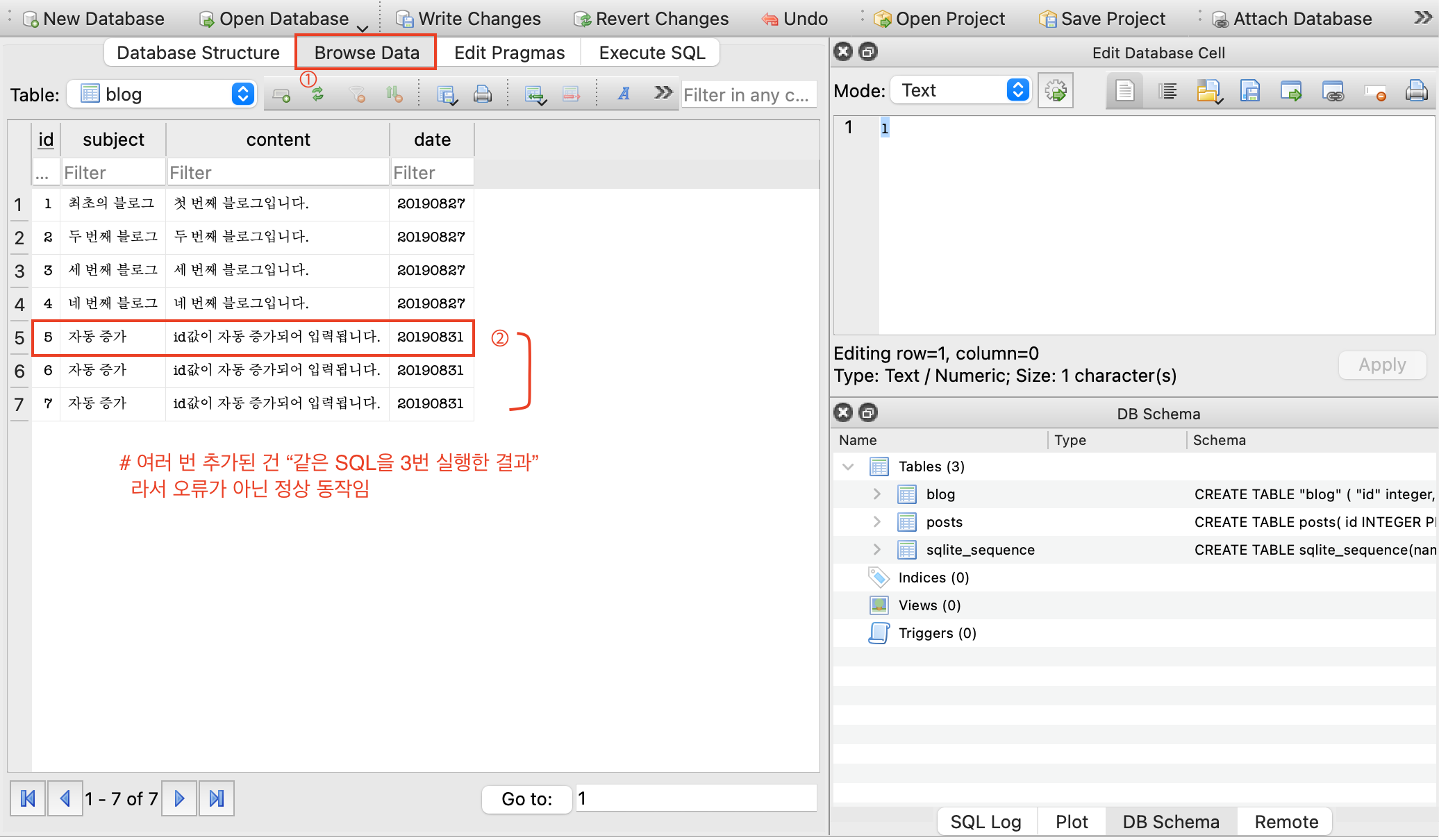 상단 탭 Browse Data 선택 → blog 내용 확인 → id 자동 증가 + 데이터 저장 완료