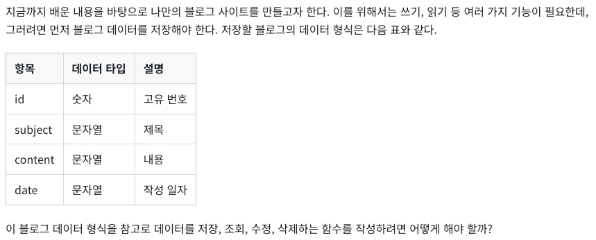 | 데이터 추가(INSERT) | **바인딩 파라미터(?)**로 안전하게 삽입. | conn.execute("INSERT INTO posts(title, body, author) VALUES(?, ?, ?)", ("첫 글", "내용", "sophia"))conn.commit() | 1행 추가, 커밋 후 저장 |
