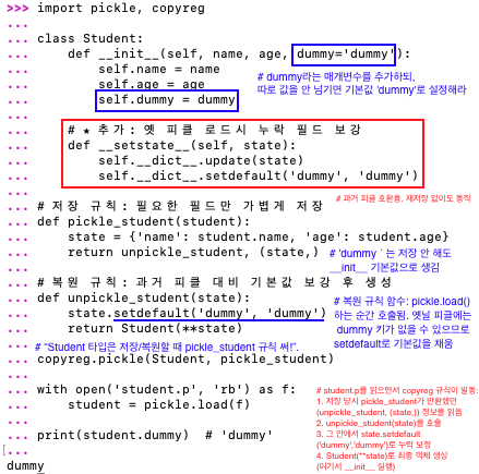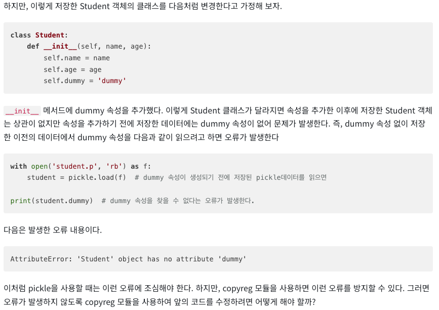 | 모듈명 | pickle로 저장된 객체가 나중에 클래스 구조가 바뀌어도 오류 없이 복원되게 도와주는 모듈 |