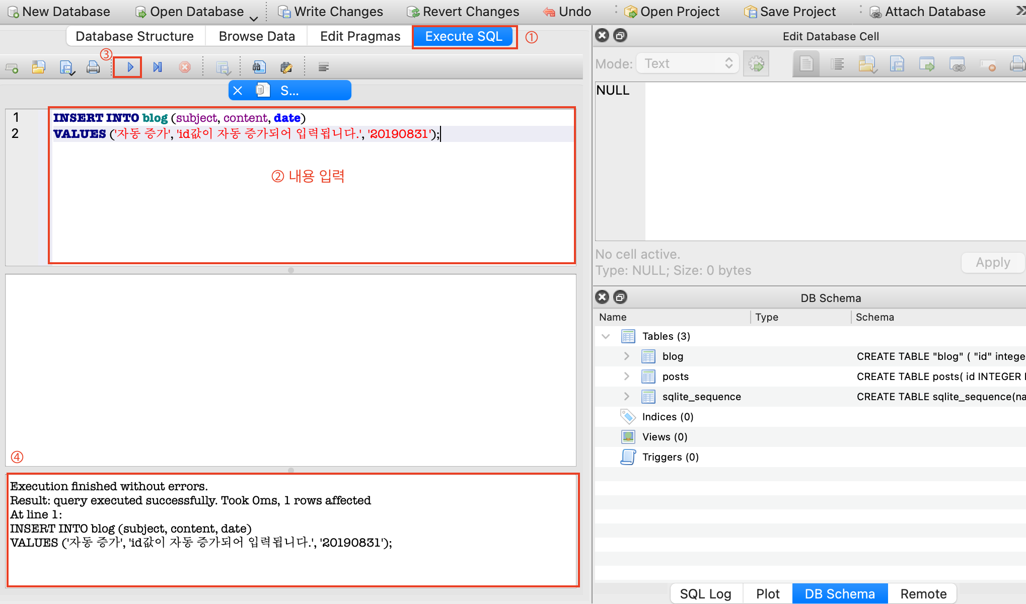 VALUES ('자동 증가', 'id값이 자동 증가되어 입력됩니다.', '20190831'); → ▶ 실행(Execute all) 버튼선택 → 하단의 메세지 확인
