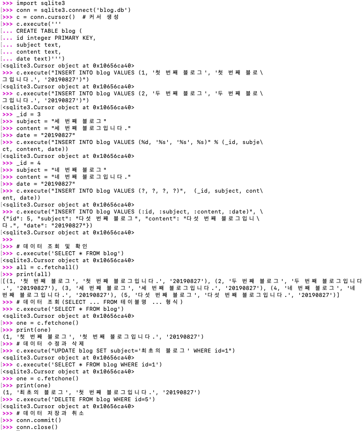 conn = sqlite3.connect('blog.db') | blog.db 파일 연결(없으면 생성) |