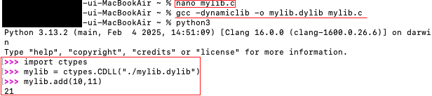 ① 파이썬 실행 > 코드 입력 import ctypes lib = ctypes.CDLL("/Users/유저네임/mylib.dylib") print(lib.add(3, 5)) |