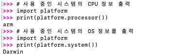 | 머신 종류 | 하드웨어 아키텍처 정보를 반환 | import platform print(platform.machine()) |