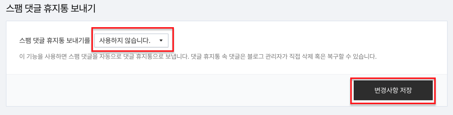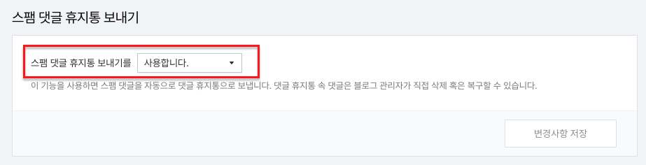 정말이다. '스팸 댓글 휴지통 보내기'기능이 자동으로 ‘사용합니다’로 체크되어 있었다.